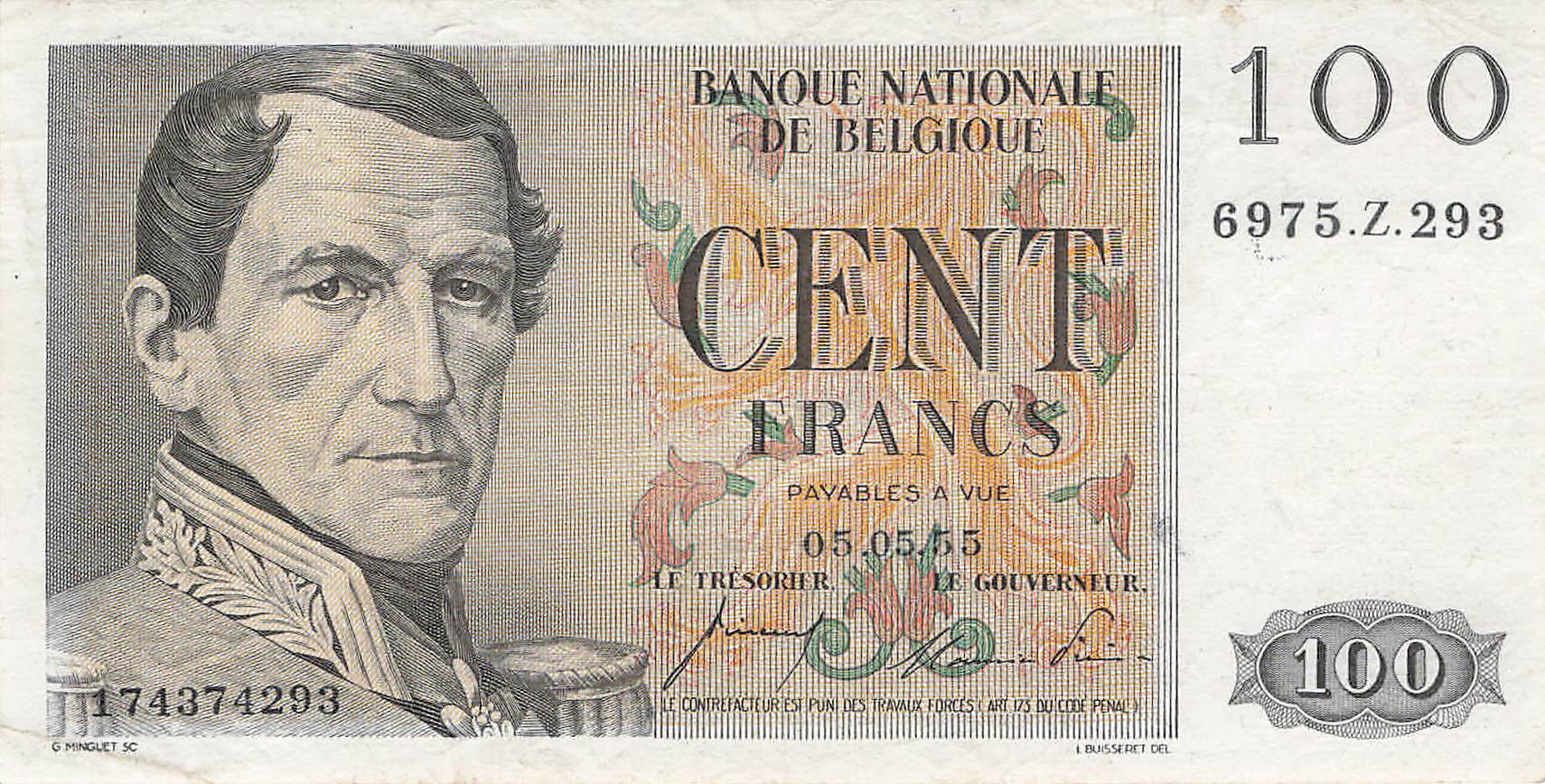 Belgien P.129b - 100 Franc 05.05.1955 VF