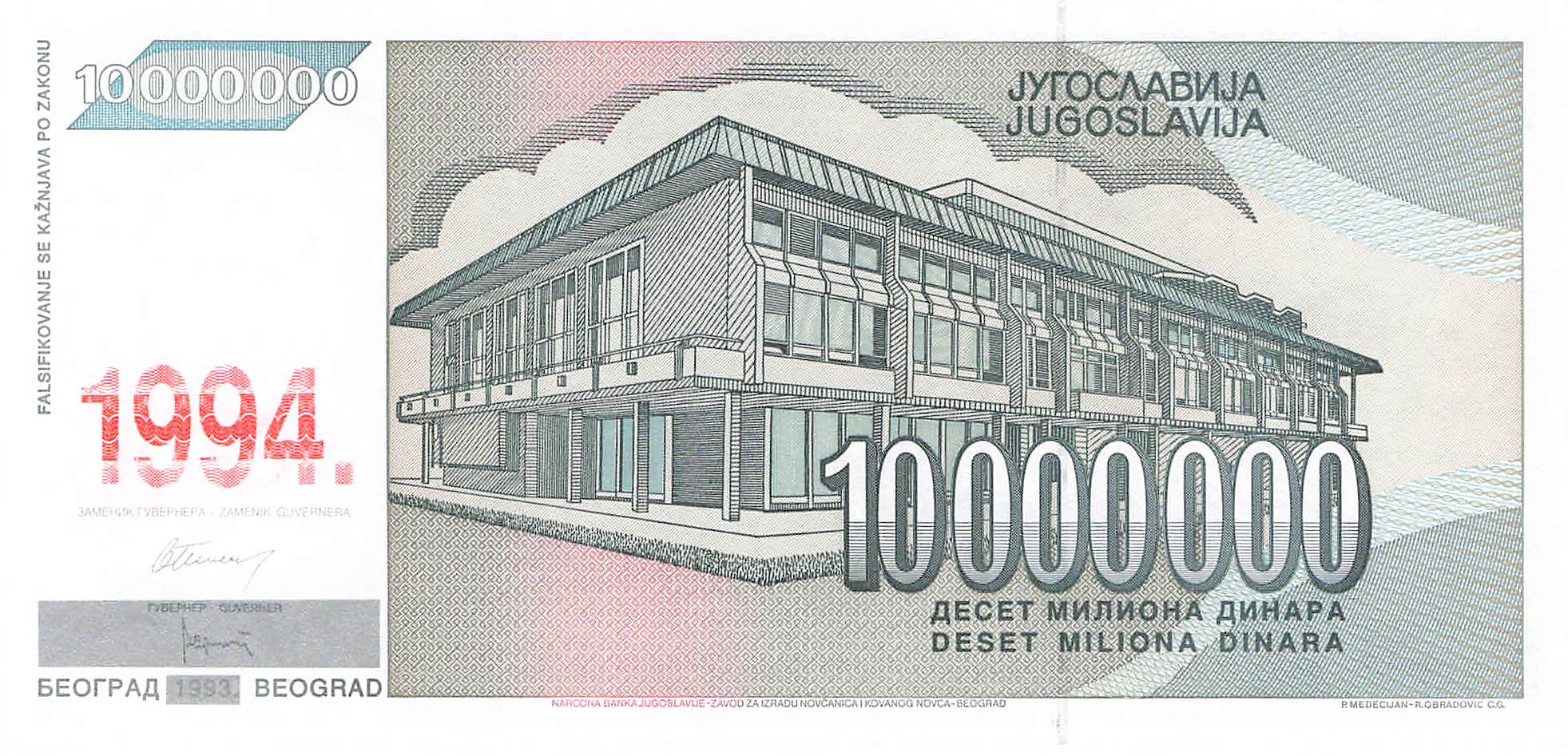 Jugoslawien P.144 - 10 Millionen Dinara 1994 UNC