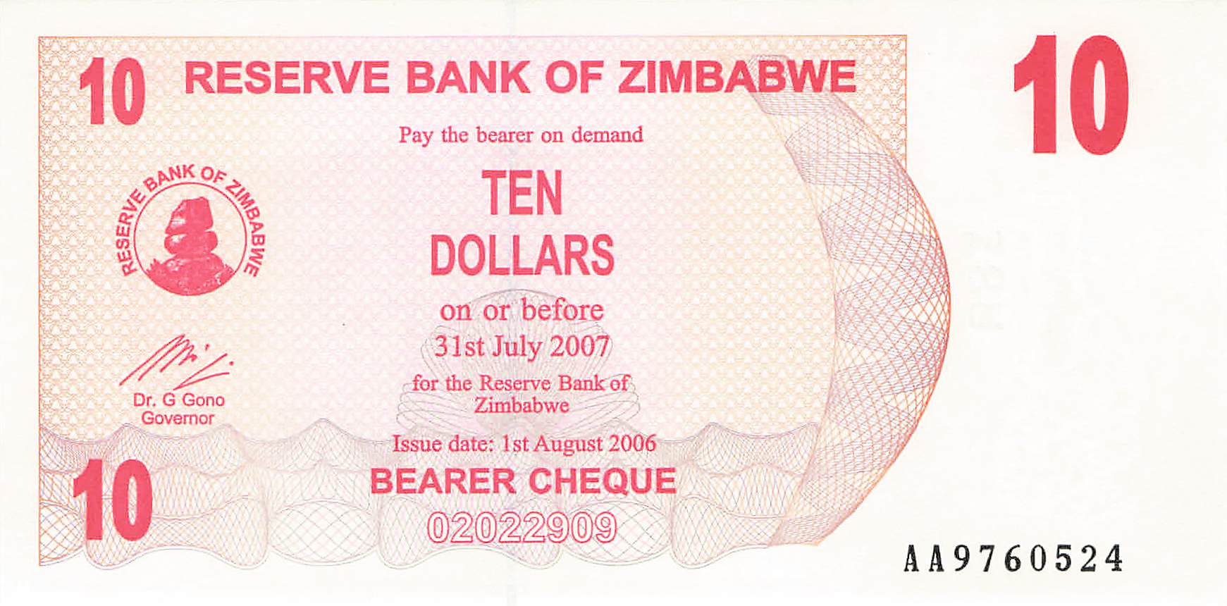 Simbabwe P.039 - 10 Dollars 2006 UNC