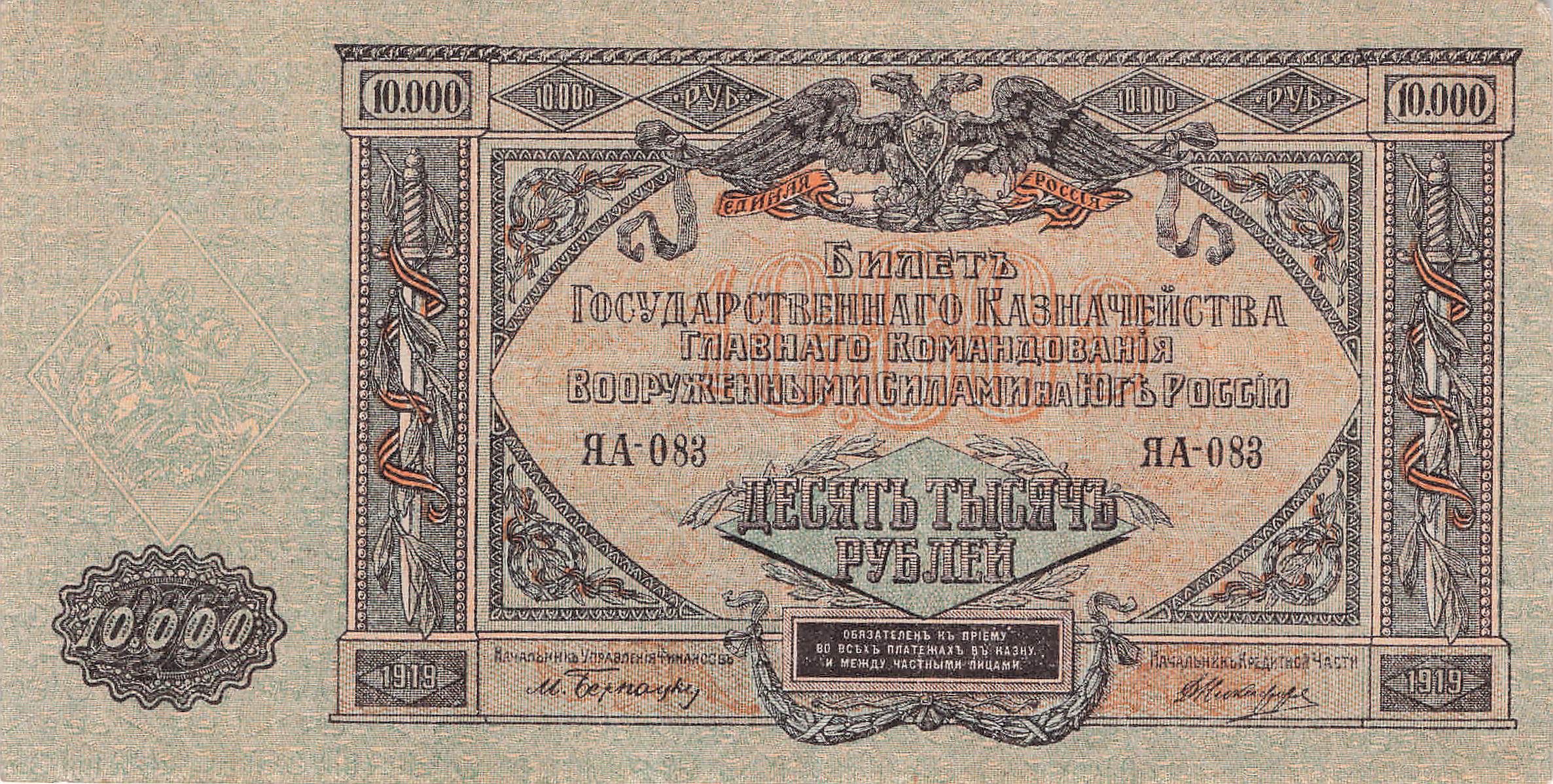 Oberkommando der Südstreitkräfte P.S425 JAA - 10000 Rubel 1919 XF
