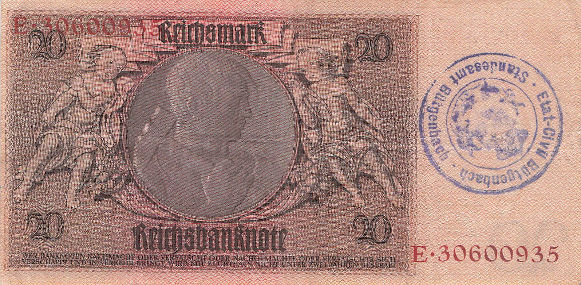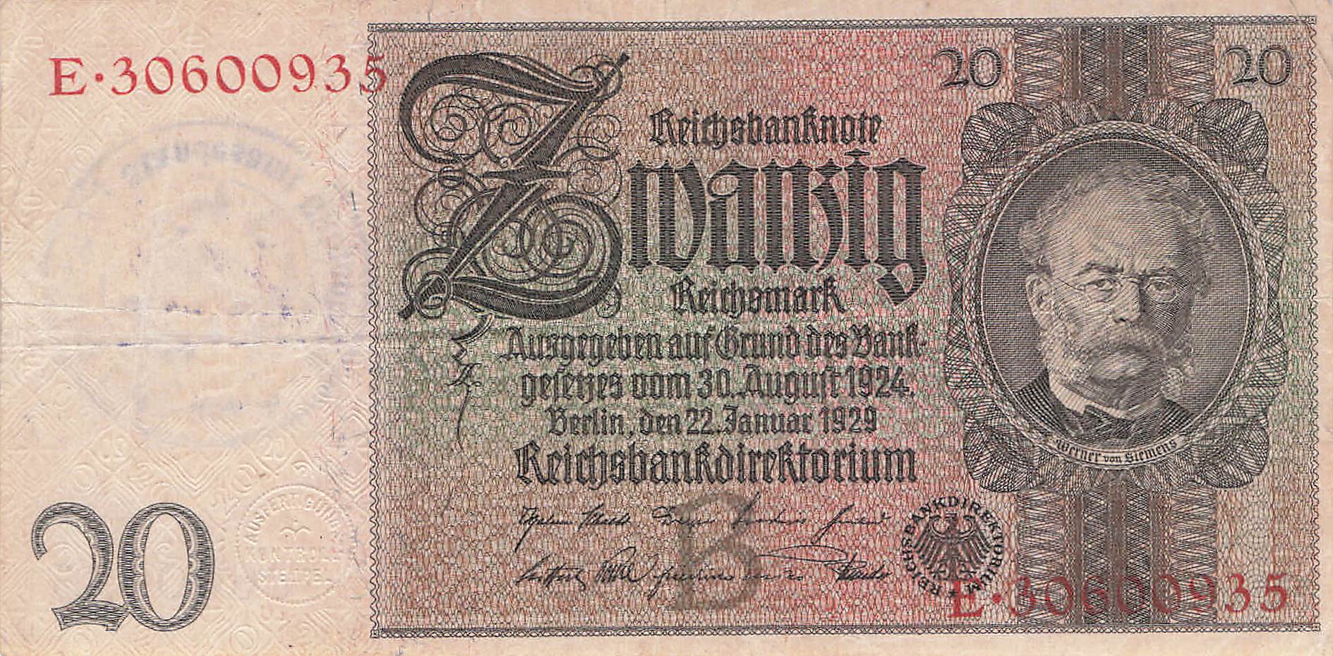 Ro.174e B/E - 20 Mark 22.01.1929 VF Gemeindestempel