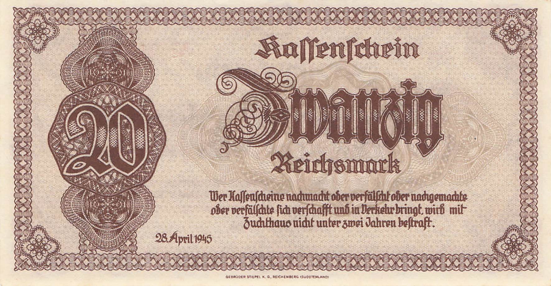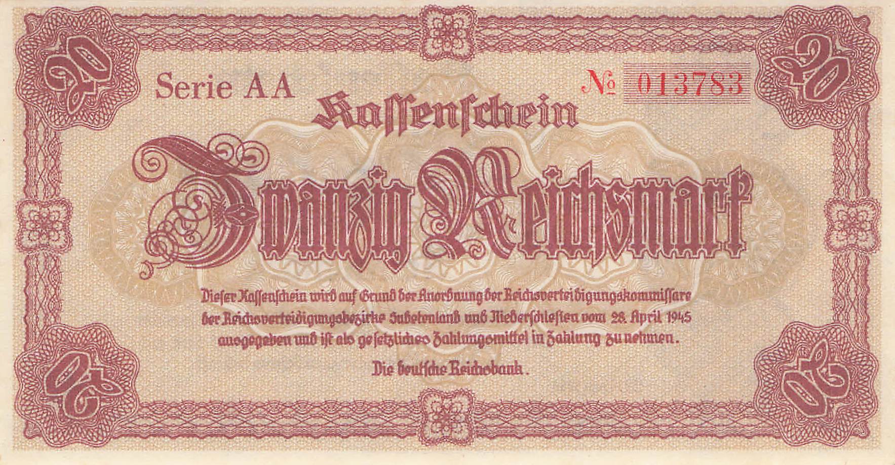 Sudetenland und Niederschl. Ro.186 Serie AA 20 Mark 1945 UNC