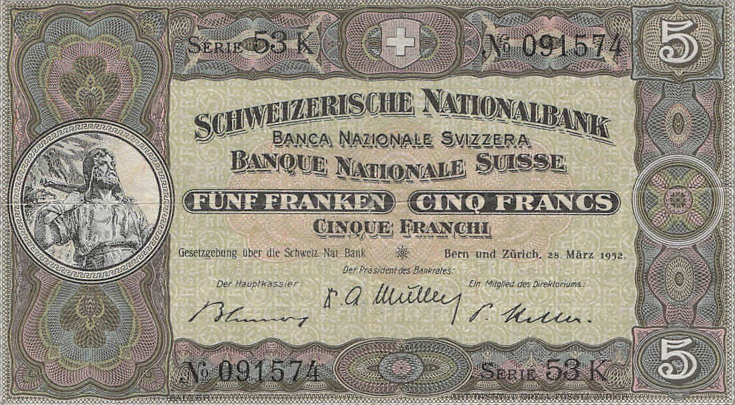 Switzerland P.011p-3 - 5 Franken 28.03.1952 VF